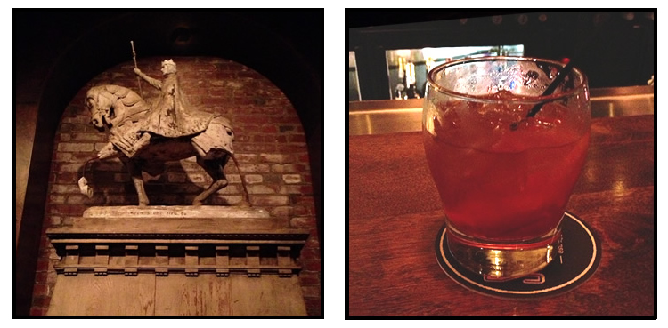 The first thing a visitor sees when entering the bar is a familiar statue. It's a smaller version of “Apotheosis of St. Louis”. The full-size version of this statue is a symbol of St. Louis city and stands in front of the St. Louis Art Museum. While at Vin de Set, I was told this smaller version was presented to Schnaider's as a gift to commemorate the 1904 World's Fair. Years later, it was found stored away in the Malt House missing its head and sword. It has since been restored and now sits impressively above the bar.